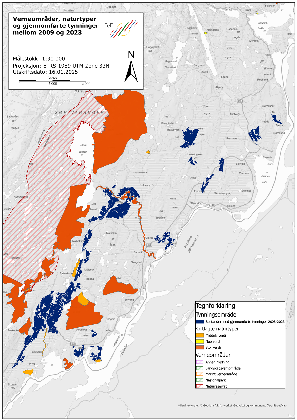 Kartet viser hvilke delbestander av skogen det er gjennomført hogst fra 2008 til 2023. Det viser også at vår skogsdrift foregår langt fra verneområdene, og kun i en liten andel av våre skogarealer. Enkelte av bestandene grenser opp mot områder kartlagt som verdifull skog, men iht. våre instrukser og retningslinjer foregår selve hogsten i god avstand fra disse områdene.